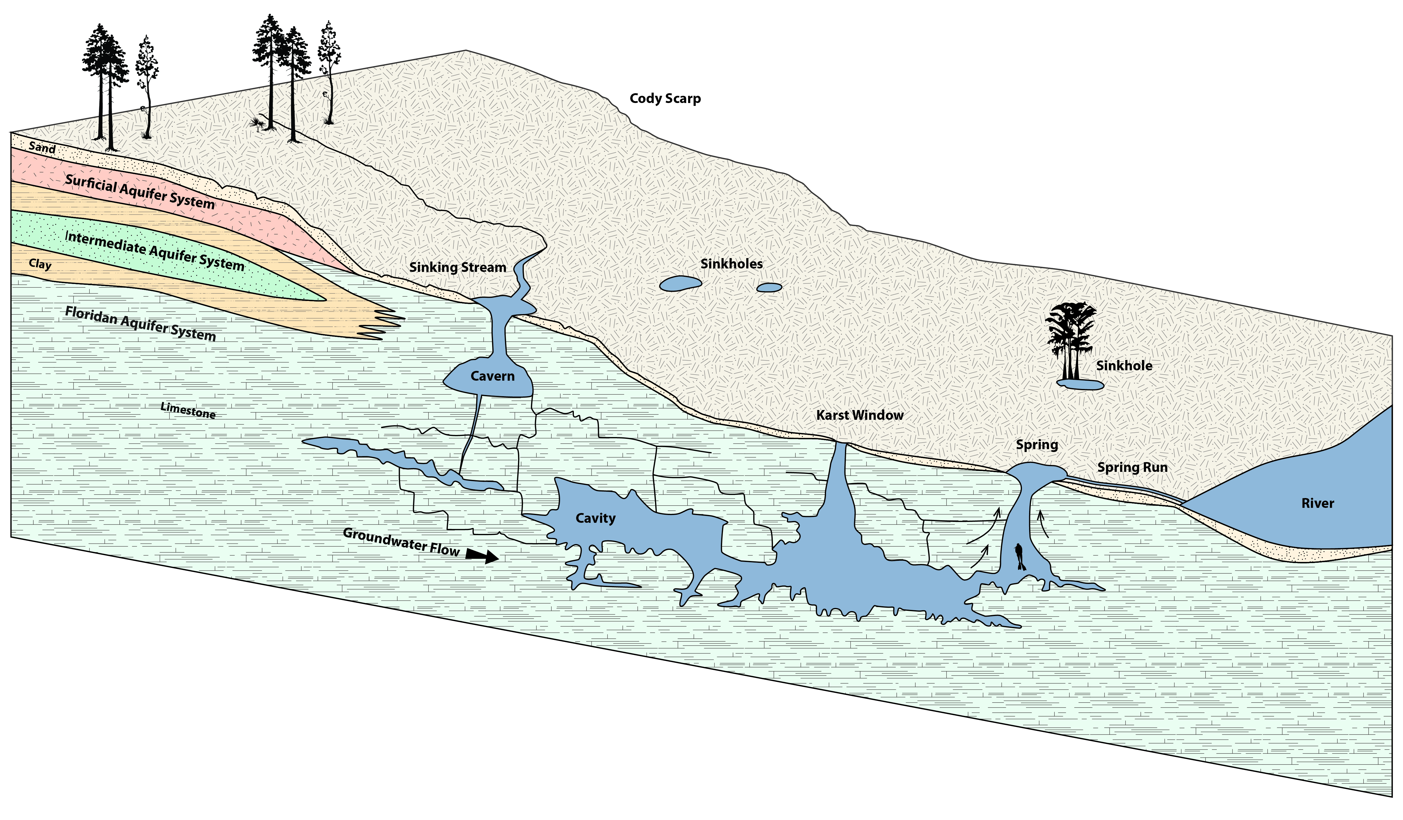 When rivers flood, the pressure created by rising floodwaters causes many springs within the Suwannee River Basin to reverse flow and bring river water into the aquifer. This reverse flow is an important part of groundwater recharge and the health of the caves associated with the springs.